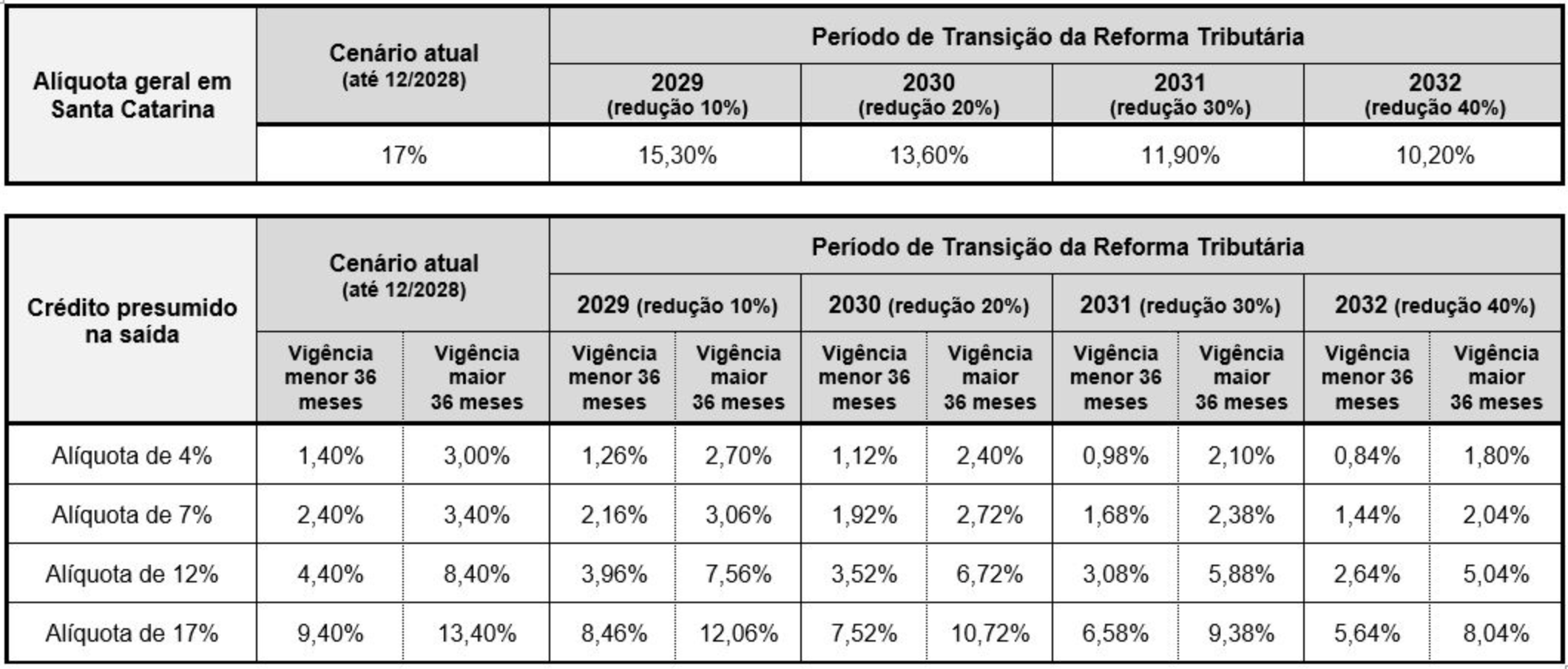 Considerando o período de transição da reforma tributária e a redução gradual dos benefícios fiscais na mesma proporção que a alíquota do imposto (nos termos do § 1º do artigo 128 do ADCT), o crédito presumido concedido pelo Estado de Santa Catarina aos estabelecimentos comerciais importadores detentores do TTD 409, 410 e 411 ficará da seguinte forma: